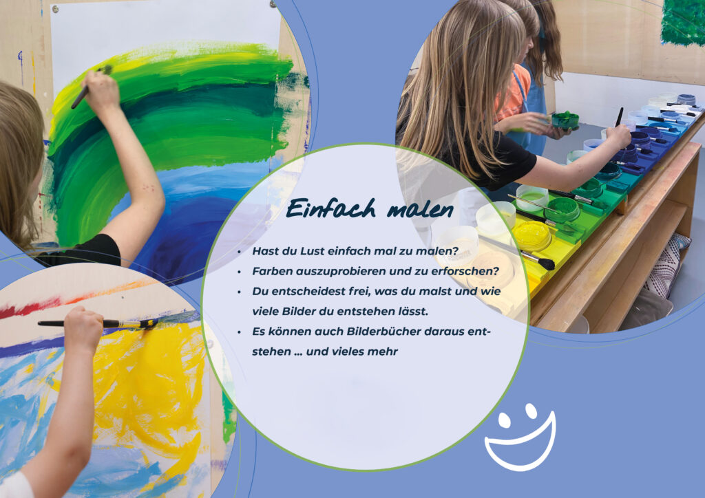 Im geschützten Atelier-Rahmen gestalten die Kinder eigene Werke und erleben, wie schön es ist, einfach loszulegen und kreativ zu sein.